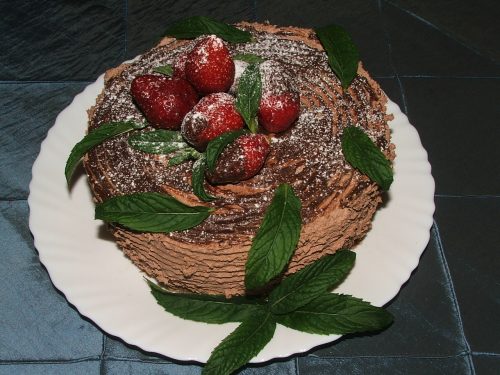 Za ukrašavanje otopiti čokoladu, pa nekoliko jagoda umočiti do pola u nju i ostaviti da se suši na pek papiru. Ostatkom čokolade ukrasiti tortu, poređati jagode i nekoliko listića svježe mente. Za malo glamura posuti šećerom u prahu.