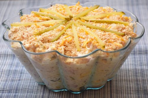 Možete ostaviti jedan krastavac, jedno jaje i malo susama za ukrašavanje. Onda narendajte na salatu jaje, pospite ga susamom, nasjecite krastavce na tanke trake i rasporedite. Ovo i ne morate…samo ako imate pet minuta više vremena.