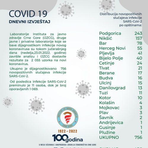 Laboratorije Instituta za javno zdravlje Crne Gore (IJZCG), druge javne i privatne laboratorije koje se bave dijagnostikom infekcije novog koronavirusa su tokom jučerašnjeg dana (nedelja 23.01.2022. godine) završile analizu i IJZCG dostavile rezultate za 2.055 uzorka na novi koronavirus.