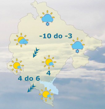 Danas će u Crnoj Gori u južnim i centralnim predjelima biti pretežno ili djelimično sunčano. Na sjeveru, tokom većeg dijela dana, pretežno oblačno, povremeno uz slab snijeg ili mećavu. Vjetar umjeren do jak, na udare veoma jak, ponegdje i olujne jačine, sjevernih smjerova. Najviša dnevna temperatura vazduha od -10 do 7 stepeni, saopšteno je iz Zavoda za hidrometeorologiju.