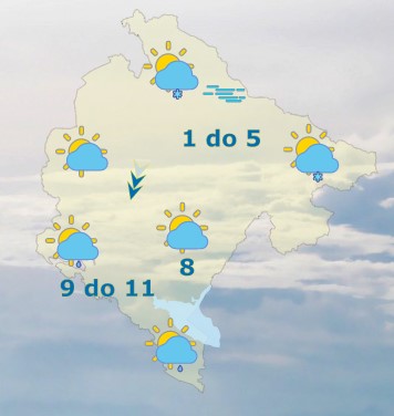 Danas će u Crnoj Gori prijepodne biti postepeno naoblačenje, prvo u južnim i zapadnim predjelima, a uglavnom od sredine dana i tokom noći ponegdje slabe padavine. Na sjeveru ujutru po kotlinama moguća magla ili niska oblačnost, a na jugu tokom prijepodneva rijetka pojava slabe kiše. Vetar slab do umjeren i promjenljiv, tokom noći umjeren do jak sjeverni. Najviša dnevna temperatura vazduha od 1 do 11 stepeni, saopšteno je iz Zavoda za hidrometeorologiju.