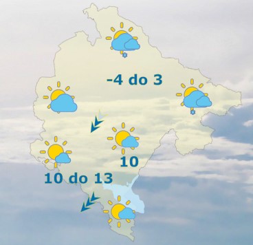 Danas će u Crnoj Gori u južnim predjelima biti sunčano, uz povremeno malu do umjerenu oblačnost. Na sjeveru umjereno do potpuno oblačno sa slabim snijegom i mećavom, uglavnom, prijepodne. Vjetar umjeren do jak, sjevernih smjerova, krajem dana i tokom noći će oslabiti. Najviša dnevna temperatura vazduha od -4 do 13 stepeni, saopšteno je iz Zavoda za hidrometeorologiju.