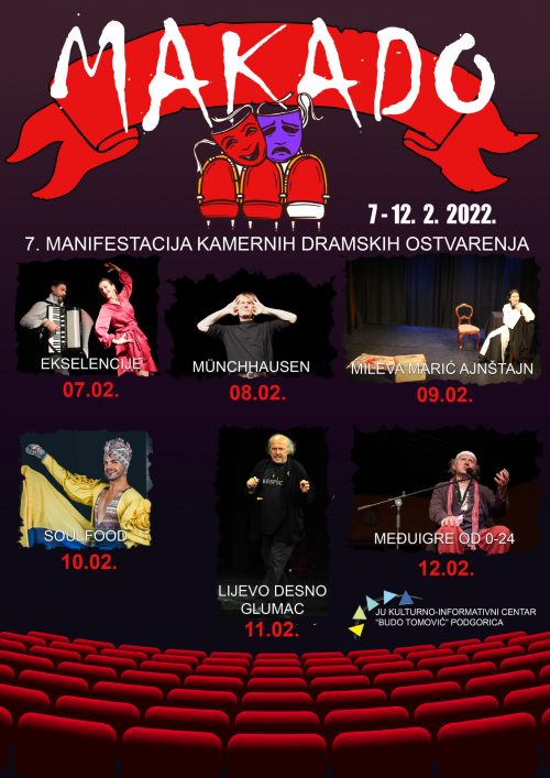 Ljubitelji teatra imaće priliku da uživaju u VII KIC-ovoj Manifestaciji kamernih dramskih ostvarenja MAKADO koja će biti organizovana od 7. do 12. februara 2022. u Dodest sali, saopšteno je iz PR službe KIC-a ,,Budo Tomović”.