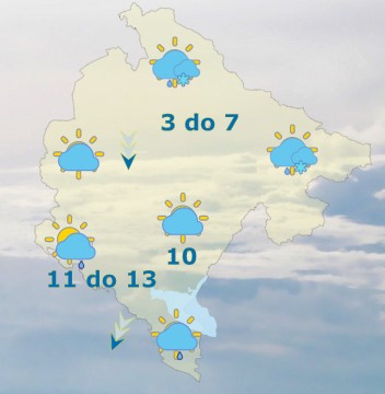 Danas će u Crnoj Gori biti umjereno do potpuno oblačno, ponegdje sa slabom kišom, a na sjeveru u planinskim oblastima i slabim snijegom. Vjetar slab do umjeren promjenljivog smjera, tokom noći ponegdje umjeren do pojačan sjeverni. Najviša dnevna temperatura vazduha od 3 do 13 stepeni.
