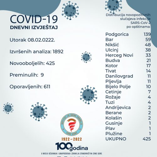 NaslovnicaDRUŠTVOIJZCG: Još 425 novozaraženih kovidom, devet osoba preminulo DRUŠTVOPREPORUKA IJZCG: Još 425 novozaraženih kovidom, devet osoba preminulo 9.02.2022. u 16:11 Dijeliti FacebookTwitterPinterestWhatsApp Tagsinstitut za javno zdravlje crne gorekorona virus Dijeliti FacebookTwitterPinterestWhatsApp Prethodni članakCEDIS: U petak, zbog radova na mreži, višesatna isključenjaNaredni članakSamsung Galaxy S22 Ultra nudi najsavršenije iskustvo S serije do sada POVEZANI TEKSTOVI DRUŠTVO KCCG: Dostupan servis prevoza za pacijente sa otežanim kretanjem 22.01.2026. u 11:49 DRUŠTVO PROTEST: Kamionima će u ponedjeljak blokirati Luku Bar i devet graničnih prelaza 22.01.2026. u 11:09 DRUŠTVO NIKŠIĆ: U saobraćajnoj nesreći jedna osoba stradala, petoro povrijeđenih 22.01.2026. u 9:02 POPULARNO KCCG: Dostupan servis prevoza za pacijente sa otežanim kretanjem 22.01.2026. u 11:49 PROTEST: Kamionima će u ponedjeljak blokirati Luku Bar i devet graničnih prelaza 22.01.2026. u 11:09 NIKŠIĆ: U saobraćajnoj nesreći jedna osoba stradala, petoro povrijeđenih 22.01.2026. u 9:02 METEO: Povremeno kiša, do 13 stepeni 22.01.2026. u 7:56 Učitati više