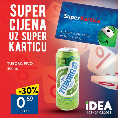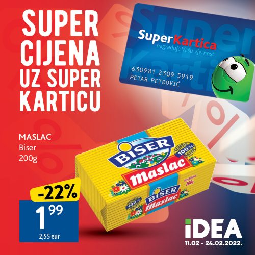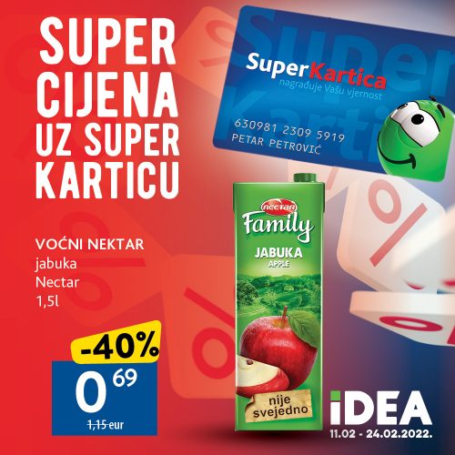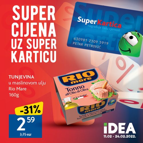 Super Kartica namijenjena je svima koji žele uštedjeti i povoljno kupovati. Sa njom jednostavno sakupljate bodove svakog dana prilikom kupovine u IDEA prodavnicama. Subotom veća kupovina znači i više bodova pa sve račune u iznosu od 20 eura i više Super kartica nagrađuje dodatnim bodovima. Super kuponi sa naslovne strane svakog IDEA kataloga su još jedan način da ostvarite uštedu. Uživajte u povoljnoj kupovini i potražite proizvode sa oznakom Super cijena uz Super Karticu na policama u IDEA prodavnicama.