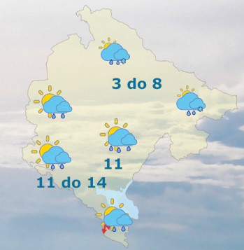 Danas će u Crnoj Gori biti pretežno oblačno sa umjerenom do jakom kišom, lokalno moguće i grmljavinom, a u planinama na sjeveru sa susnježicom i snijegom. Sredinom dana ili poslijepodne padavine će znatno oslabiti ili prestati, prvo u jugozapadnim i zapadnim predjelima, uz postepeno razvedravanje. Vjetar uglavnom slab do umjeren, promjenljivog smjera. Najviša dnevna temperatura vazduha od 3 do 14 stepeni, saopšteno je iz Zavoda za hidrometeorologiju.
