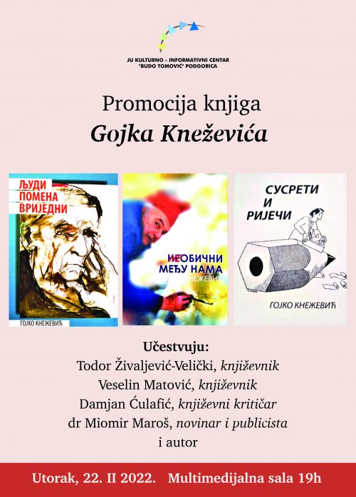 Promocija knjiga Gojka Kneževića, novinara „Pobjede“ u penziji biće održana u utorak, 22. februara u Multimedijalnoj sali KIC-a „Budo Tomović“ u 19 sati, saopšteno je iz PR službe KIC-a ,,Budo Tomović”.