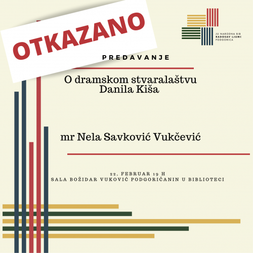 Predavanje o dramskom stvaralaštvu Danila Kiša je otkazano usljed bolesti predavača. Kada prilike to dozvole, predavanje će biti organizovano, a javnost blagovremeno obaviještena, saopšteno je iz Narodne biblioteke Radosav Ljumović.