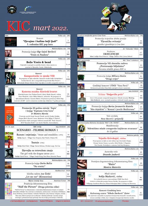 Promocija 20 godina emisije ,,Zapis” i knjiga ,,Zapisana Crna Gora” dr Miomira Maroša održaće se 11. marta, a u KIC-u će 24. marta biti promovisana i nova književna izdanja ,,Ako dojedrim” i ,,Konzul i juvelir Mediterana” Borisa ,,Jovanovića Kastela. KIC će biti domaćin i promocije knjige .Fenix ex Pandora” Olge Gojnić Borilović, knjige ,,Na vrtešci” Darka Bulića, trojezične zbirke poezije ,,Pjesnička svitanja” pjesnika i pjesnikinja iz Crne Gore, knjige ,,Drugi svijet” Milisava Rosića, a održaće se i manifestacija ,,Afirmišimo mlade crnogorske književne stvaraoce” do 18 godina.