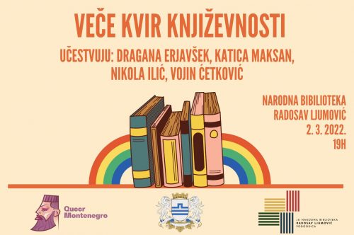 U Narodnoj biblioteci ,,Radosav Ljumović” sjutra (2. mart), u 19 sati, biće održano književno veče posvećeno kvir književnosti, saopšteno je iz NB ,,Radosav Ljumović”.