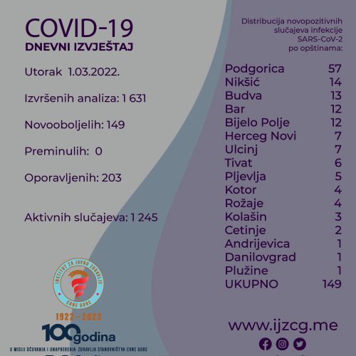 NaslovnicaDRUŠTVOIJZCG: Još 149 novozaraženih kovidom, nema preminulih DRUŠTVOPREPORUKA IJZCG: Još 149 novozaraženih kovidom, nema preminulih 2.03.2022. u 16:18 Dijeliti FacebookTwitterPinterestWhatsApp Tagsinstitut za javno zdravlje crne gorekorona virus Dijeliti FacebookTwitterPinterestWhatsApp Prethodni članakCEDIS: U petak, zbog radova na mreži, višesatna isključenjaNaredni članakPODGORICA: Potrošači iz četiri naselja sjutra više sati bez vode POVEZANI TEKSTOVI DRUŠTVO SAVIN KUK: Nakon nesreće troje turista uspješno evakuisano 20.12.2025. u 18:27 DRUŠTVO UPRAVA POLICIJE: Dojava o bombi u tržnom centru u Podgorici bila lažna 20.12.2025. u 17:19 DRUŠTVO NESREĆA NA SAVINOM KUKU: Poginuo turista nakon pada iz korpe 20.12.2025. u 15:18 POPULARNO SAVIN KUK: Nakon nesreće troje turista uspješno evakuisano 20.12.2025. u 18:27 UPRAVA POLICIJE: Dojava o bombi u tržnom centru u Podgorici bila lažna 20.12.2025. u 17:19 NESREĆA NA SAVINOM KUKU: Poginuo turista nakon pada iz korpe 20.12.2025. u 15:18 PODGORICA: Policija provjerava dojavu o bombi u tržnom centru 20.12.2025. u 15:14 Učitati više