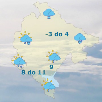 Danas će u Crnoj Gori biti umjereno do pretežno oblačno, povremeno i mjestimično sa padavinama, uglavnom snijeg, a u nižim predjelima na jugu kiša ili pljusak. Ponegdje i na jugu moguće slabo provijavanje snijega. Vjetar slab do umjeren promjenljivog smjera, krajem dana sjeverni i sjeveroistočni, u pojačanju. Najviša dnevna temperatura vazduha od -3 do 11 stepeni, saopšteno je iz Zavoda za hidrometeorologiju.
