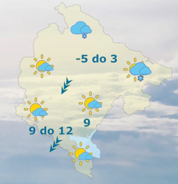 Danas će u južnim i centralnim predjelima Crne Gore biti pretežno sunčano ili malo do umjereno oblačno, a na sjeveru pretežno oblačno, uz povremeno provijavanje slabog snijega. Vjetar umjeren do jak, sjeverni i sjeveroistočni. Najviša dnevna temperatura vazduha od -5 do 12 stepeni, saopšteno je iz Zavoda za hidrometeorologiju.