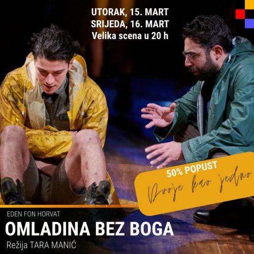 Predstava „Omladina bez Boga“ koju je po tekstu Edena fon Horvata režirala Tara Manić biće izvedena u utorak 15. marta i srijedu 16. marta u 20 sati na Velikoj sceni, saopšteno je iz PR službe Crnogorskog narodnog pozorišta.