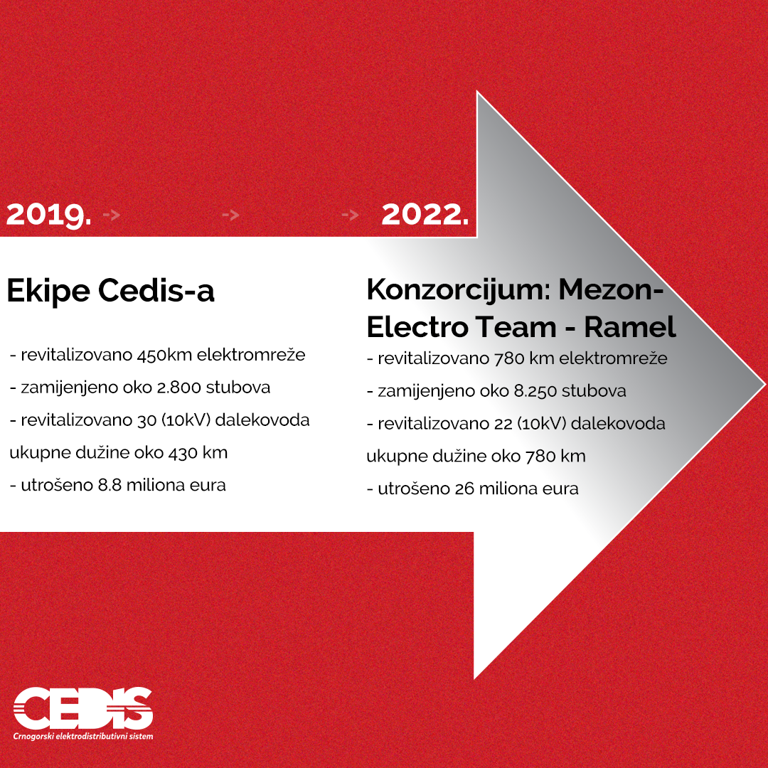 CEDIS je za revitalizaciju značajanog procenta elektromreže na ruralnom području gotovo svih crnogorskih opština, od 2019. godine izdvojio ukupno 34.8 miliona eura. Zahvaljujući ovom ulaganju i stručnom upravljanju projektom, rekonstruisano je čak 1.230 km distributivne elektromreže, zamijenjeno blizu 11 hiljada stubova i značajno unaprijeđen kvalitet napajanja za oko 29 hiljada seoskih domaćinstava.