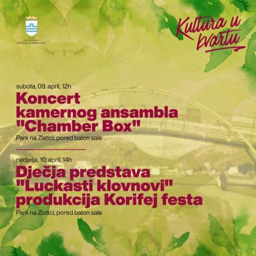 U subotu 9. aprila, u 12 sati, biće održan koncert kamernog ansambla ,,Chamber box”. Na repertoaru će, osim klasičnih, biti i poznate filmske teme, kao i teme iz popularne muzike.