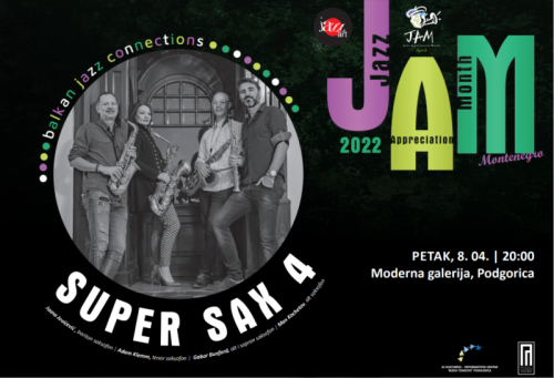 Koncert kvarteta saksofona „SUper Sax 4” biće održan u okviru manifestacije ,,Mjesec poštovanja džeza u Crnoj Gori – JAM 2022” u petak, 8. aprila, u Modernoj galeriji Muzeja i galerija Podgorice (ul. Marka Miljanova br. 4), u 20 sati, saopšteno je iz PR službe KIC-a ,,Budo Tomović”.