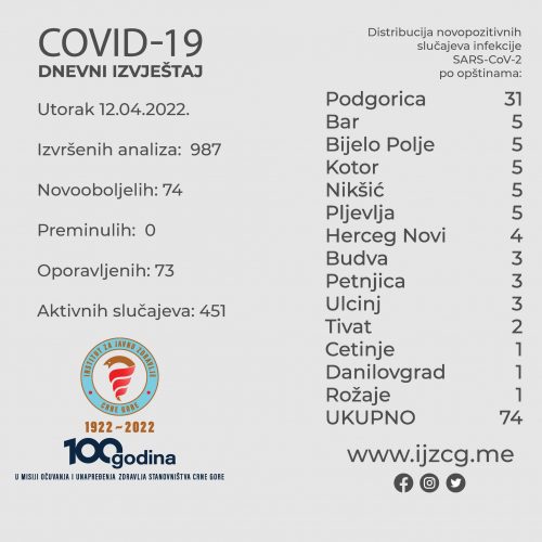 NaslovnicaDRUŠTVOIJZCG: Još 74 novozaražena kovidom