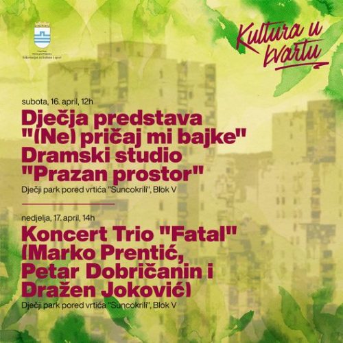 Program Sekretarijata za kulturu i sport Glavnog grada Podgorica ,,Kultura u kvartu” predstojećeg vikenda biće organizovan u novom parku u blizini vrtića ,,Suncokrili” u Bloku V.