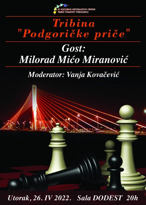 Tribina ,,Podgoričke priče” koja ima želju i namjeru da ne zaboravi ljude koji su svojim djelanjem i djelovanjem tkali kulturnu i stvaralačku nit Glavnog grada i Crne Gore, ovog mjeseca ugostiće Milorada Mića Miranovića, koji će podijeliti znanje i iskustvo, ali i anegdote i legende, kako grada tako i ljudi koji su obilježili prostor i vrijeme, koji nemaju granice.