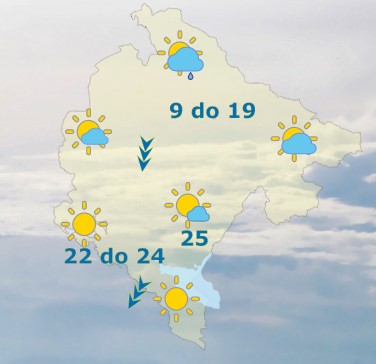 Danas će u Crnoj Gori biti pretežno sunčano, a na sjeveru umjereno do potpuno oblačno, uz rijetku pojavu slabe kiše. Vjetar umjeren do jak, na udare ponegdje i veoma jak sjeverni i sjeveroistočni. Najviša dnevna temperatura vazduha od 9 do 25 stepeni, saopšteno je iz Zavoda za hidrometeorologiju.