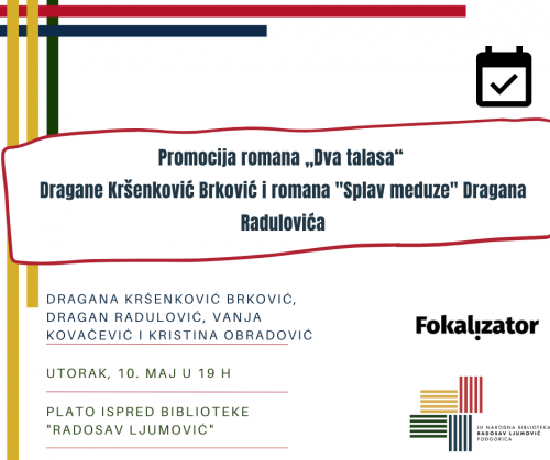 Na platou ispred Narodne biblioteke ,,Radosav Ljumović” sjutra (10. maj) u 19 sati biće održana promocija romana „Dva talasa“ Dragane Kršenković Brković, kao i romana „Splav meduze“ Dragana Radulovića. Oba romana su u izdavaštvu izdavačke kuće „Fokalizator“, saopšteno je iz PR službe NB ,,Radosav Ljumović”.