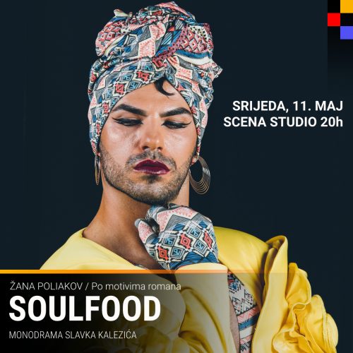 Monodrama ,Soulfood”, autorski projekat Slavka Kalezića rađen po tekstu Žane Poliakov, biće izvedena u srijedu 11. maja u 20 sati na Sceni Studio, saopšteno je iz PR službe Crnogorskog narodnog pozorišta.