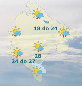Danas će u Crnoj Gori biti promjenljivo oblačno, na jugu sa dužim sunčanim periodima. U kontinentalnim predjelima mjestimično se očekuje kiša, pljuskovi i grmljavina, na sjeveru već ujutru ili prijepodne. Vjetar slab do umjeren, promjenljivog smjera. Najviša dnevna temperatura vazduha 18 do 28 stepeni, saopšteno je iz Zavoda za hidrometeorologiju.