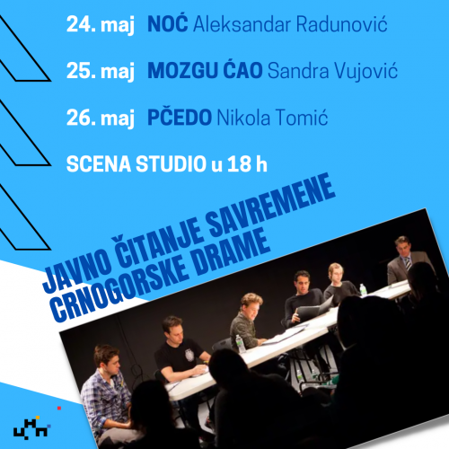 Javno čitanje drama će se izvesti 24, 25. i 26. maja, na Sceni Studio Crnogorskog narodnog pozorišta, u 18 sati, u izvedbi mladih crnogorskih glumaca i glumica (Lazar Dragojević, Danica Rajković, Mirjana Spaić , Pavle Bogojević). U pitanju su drame ,,Noć” Aleksandra Radunovića, ,,Mozgu, ćao“ Sandre Vujović i ,,Pčedo” Nikole Tomića. Javnim čitanjem drama se Crnogorsko narodno pozorište već bavilo u protekloj deceniji. Javno čitanje je veoma važno, ne zbog same drame, koja danas brzopleto mijenja svoju formu i jednako pripada i prozi i poeziji, te duboko zalazi u druge medije, već i zbog pozicije u kojoj se nedavno našao teatar, samim tim i autori, pa svaki pomak prema publici, čak i u najitimnijoj formi, danas predstavlja značajnu stvar, prije svega za autore i njihove tekstove. Nakon čitanja, autori će razgovarati o svojim tekstovima, o poetici, o savremenoj crnogorskoj drami i dramaturgiji.