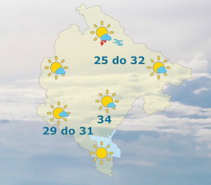 Danas će u Crnoj Gori biti pretežno sunčano i toplo, uz povremeno malu ili umjerenu oblačnost. U popodnevnim satima, u sjevernim predjelima, ponegdje uz pojačan razvoj oblačnosti kratkotrajno moguća kiša ili pljusak i grmljavina. Vjetar slab do umjeren, promjenljivog smjera. Najviša dnevna temperatura vazduha 25 do 34 stepena, saopšteno je iz Zavoda za hidrometeorologiju.