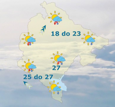 Danas će u Crnoj Gori biti promjenljivo oblačno, sa sunčanim intervalima ali mjestimično i kiša ili pljusak praćen grmljavinom. Ponegdje su moguće i kratkotrajne vremenske nepogode. Vjetar južnih smjerova, slab do umjeren, ponegdje pojačan. Najviša dnevna temperatura vazduha 18 do 27 stepeni, saopšteno je iz Zavoda za hidrometeorologiju.