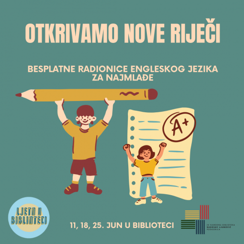 Radionica engleskog jezika ,,Otkrivamo nove riječi”, namijenjena djeci uzrasta od 1. do 4. razreda osnovne škole, biće održana u subotu (11. juna) od 10 do 11 sati u Biblioteci ,,Radosav Ljumović”, saopšteno je iz PR službe NB ,,Radosav Ljumović”.