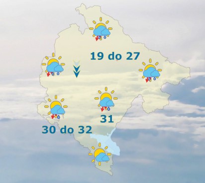 Danas će u Crnoj Gori biti promjenljivo oblačno, u južnim predjelima sa dužim sunčanim intervalima. Od sredine dana, u kontinentalnim predjelima i planinskom zaleđu Boke, mjestimično kiša ili pljusak praćen grmljavinom. Ponegdje su moguće i kratkotrajne vremenske nepogode. Vjetar uglavnom sjevernih smjerova, slab do umjeren, krajem dana i tokom noći umjeren do jak. Najviša dnevna temperatura vazduha 20 do 32 stepena, saopšteno je iz Zavoda za hidrometeorologiju.