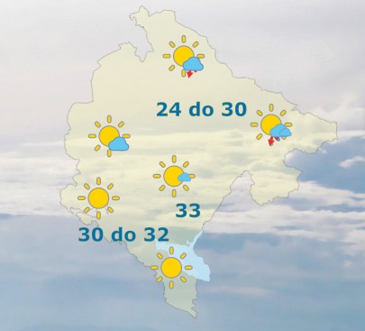 Danas će u Crnoj Gori biti pretežno sunčano i toplo. U popodnevnim satima, uz umjeren razvoj oblačnosti, u sjevernim predjelima, ponegdje kiša ili pljusak i grmljavina. Vjetar slab do umjeren, promjenljivog smjera. Najviša dnevna temperatura vazduha 24 do 34 stepena, saopšteno je iz Zavoda za hidrometeorologiju.