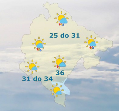 Danas će u Crnoj Gori biti promjenljivo oblačno, u južnim predjelima sa dužim sunčanim intervalima i toplo. U kontinentalnim oblastima, prvenstveno na sjeveru, mjestimično se očekuje kiša ili pljusak sa grmljavinom, naročito u noćnim satima. Vjetar uglavnom slab do umjeren promjenljivog smjera, u sjevernim predjelima ponegdje pojačan, zapadni i sjeverozapadni. Najviša dnevna temperatura vazduha 25 do 36 stepeni, saopšteno je iz Zavoda za hidrometeorologiju.