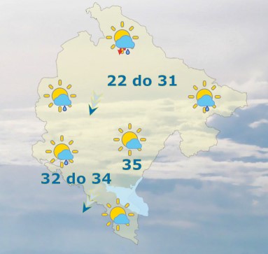Danas će u Crnoj Gori biti promjenljivo oblačno, u južnim predjelima tokom prijepodneva sa dužim sunčanim intervalima. Ponegdje se očekuje i kiša ili pljusak i grmljavina, na sjeveru moguće već tokom jutra. Vjetar mjestimično umjeren do jak, na udare ponegdje i veoma jak, sjevernih smjerova. Najviša dnevna temperatura vazduha 22 do 35 stepeni, saopšteno je iz Zavoda za hidrometeorologiju.