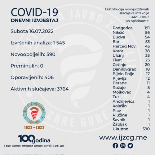 Iz Instituta za javno zdravlje Crne Gore saopšteno je da je registrovano još 590 slučajeva koronavirusa. U posljednja 24 sata nije bilo preminulih od posljedica koronavirusa. Oporavilo se još 406 pacijenata, a trenutno je 3764 oboljelih.