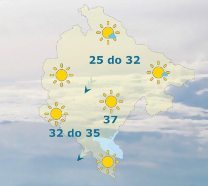 Danas će u Crnoj Gori biti sunčano i toplo, ponegdje uz slab do umjeren razvoj dnevne oblačnosti. Vjetar slab do umjeren i promjenljiv, prvenstveno u jutarnjim i noćnim satima, ponegdje umjeren do pojačan, na udare lokalno i jak sjeverni i sjeveroistočni. Najviša dnevna temperatura vazduha od 25 do 37 stepeni, saopšteno je iz Zavoda za hidrometeorologiju.