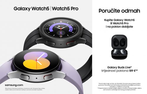 Ukoliko u periodu od 10.8. do 25.8. kupite Galaxy Watch5 ili Watch5 Pro na poklon dobijate Galaxy Buds Live slušalice u mistično crnoj boji u vrijednosti od 189 EUR.