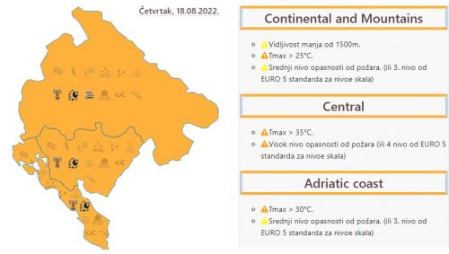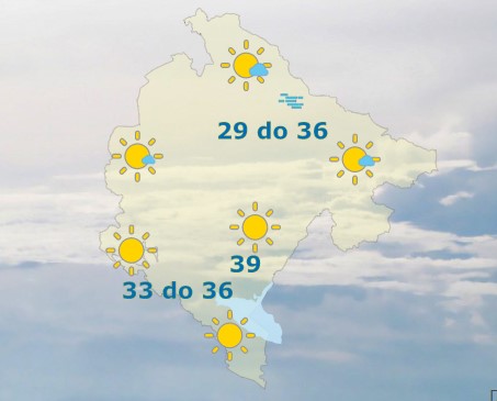 Danas će u Crnoj Gori biti pretežno sunčano i veoma toplo. Na sjeveru, ujutru po kotlinama magla. Vjetar slab do umjeren, promjenljivog smjera. Najviša dnevna temperatura vazduha od 29 do 39 stepeni, saopšteno je iz Zavoda za hidrometeorologiju.