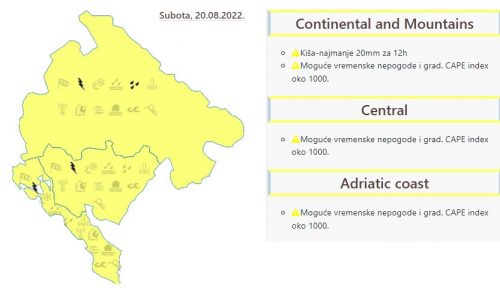Danas će u Crnoj Gori biti promjenljivo i nestabilno, uz promjenljivu oblačnost i sunčane intervale, mjestimično se očekuje kiša, pljuskovi i grmljavina. Usled jake nestabilnosti, lokalno su moguće i kratkotrajne vremenske nepogode. U poslijepodnevnim satima na jugu, a u večernjim u većem dijelu zemlje, se očekuje uglavnom suvo vrijeme. Vjetar promjenljivog smjera, slab do umjeren, tokom procesa ponegdje kratkotrajno moguć i pojačan. Najviša dnevna temperatura vazduha od 21 do 32 stepena, saopšteno je iz Zavoda za hidrometeorologiju.
