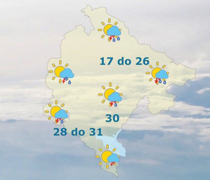 Danas će u Crnoj Gori biti promjenljivo oblačno, uglavnom u kontinentalnim predjelima i na području Boke, mjestimično kiša ili pljusak i grmljavina. Više uslova za padavine u popodnevnim satima, a na jugu se očekuju i duži sunčani intervali. Vjetar slab do umjeren, ponegdje kratkotrajno pojačan, promjenljivog smjera. Najviša dnevna temperatura vazduha od 21 do 31 stepen, saopšteno je iz Zavoda za hidrometeorologiju.