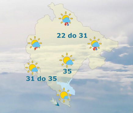Danas će u Crnoj Gori biti pretežno sunčano. Ujutru, na sjeveru, ponegdje umjerena oblačnost, a po kotlinama moguća magla. U poslijepodnevnim satima u kontinentalnim predjelima uz povećan razvoj oblačnosti, moguća je kratkotrajna kiša ili lokalni pljusak sa grmljavinom. Vjetar slab do umjeren, promjenljivog smjera, a na krajnjem jugoistoku, povremeno pojačan, sjeverozapadni. Najviša dnevna temperatura vazduha od 23 do 36 stepeni, saopšteno je iz Zavoda za hidrometeorologiju.