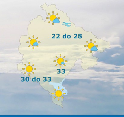 Danas će u Crnoj Gori biti pretežno sunčano, uz mali ili umjereni razvoj oblaka u poslijepodnevnim satima. Na sjeveru, tokom jutra, ponegdje umjerena oblačnost ili magla. Vjetar slab do umjeren, promjenljivog smjera. Najviša dnevna temperatura vazduha od 22 do 33 stepena, saopšteno je iz Zavoda za hidrometeorologiju.