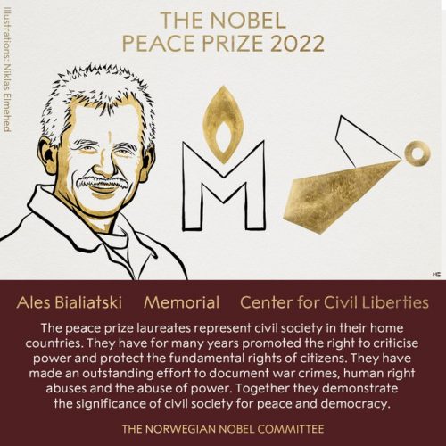 Dobitnici Nobelove nagrade za mir za 2022. su bjeloruski aktivista Aleš Beljacki, ruska organizacija za zaštitu ljudskih prava Memorial i ukrajinska organizacija Centar za građanske slobode, saopštio je norveški Nobelov komitet.
