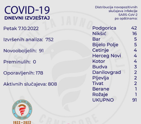 -Laboratorije Instituta za javno zdravlje Crne Gore (IJZCG), druge javne i privatne laboratorije koje se bave dijagnostikom infekcije novog koronavirusa su tokom jučerašnjeg dana (petak 07. 10. 2022. godine) završile analizu i IJZCG dostavile rezultate za 752 uzorka na novi koronavirus. Ukupno je dijagnostikovan 91 novopozitivni slučaj infekcije SARS-CoV-2 – saopšteno je iz IJZ-a.