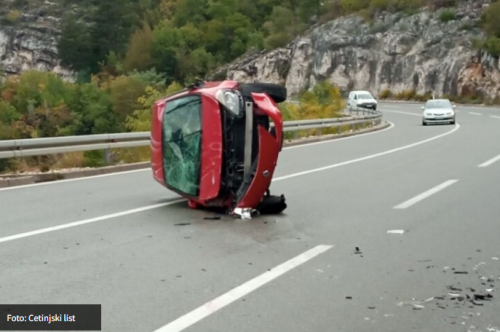 Vozač Renoa K.I. (40) iz Tivta, tivatskih registarskih oznaka TV AH 258 prošao je bez povreda nakon što je udario u brdo i prevrnuo sa na magistrali Cetinje – Podgorica kod tunela Mekavac.
