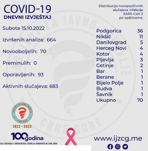 Oporavile su se još 93 osobe, pa su trenutno aktivna 683 slučaja koronavirusa, objavljeno je iz Instituta za javno zdravlje.