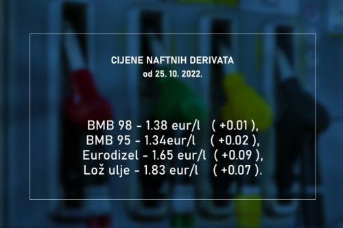 BMB 98 biće skuplji za cent i koštaće 1.38 eura, BMB 95 poskupiće dva centa i njegova cijena iznosiće 1.34 eura po litru. Najveće poskupljenje, za devet centi, bilježi eurodizel i od ponoći će koštati 1.65 eura po litru. Lož ulje će biti skuplje sedam centi i koštaće 1.83 eura po litru.